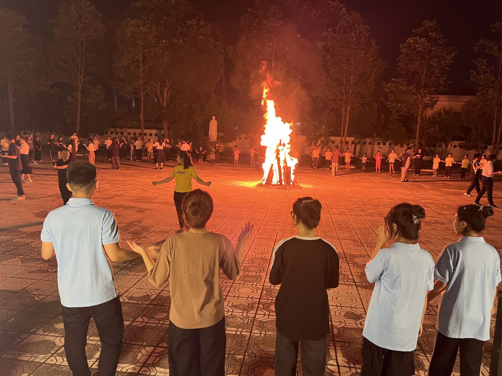 Sau giờ cơm tối, các em cùng tham gia sinh hoạt lửa trại. Dưới sự hướng dẫn của thày quản trò và các anh chị linh hoạt viên, các em cùng được hòa nhịp trong các bài hát sinh hoạt và vũ điệu sôi nổi. Khép lại tối sinh hoạt, các em cùng lắng đọng bên lửa thiêng để dâng lời cầu nguyện tạ ơn Chúa, cầu cho các đấng bậc, các ân nhân, các phụ trách và cho chính mình cùng các bạn học sinh đồng trang lứa.